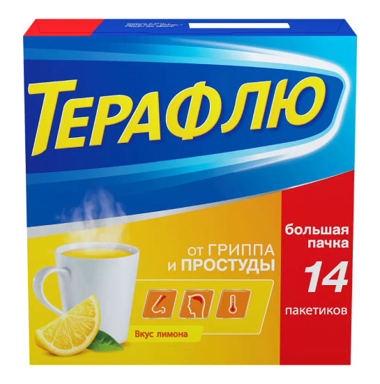 ТЕРАФЛЮ СО ВКУСОМ ЛИМОНА от гриппа и простуды. В экономичной упаковке с выгодой в 3 пакетика**. Предназначен для симптоматического лечения инфекционно-восполительных заболеваний (ОРВИ, в том числе гриппа), сопровождающихся высокой температурой, ознобом, ломотой в теле, головной и мышечной болью, насморком, заложенностью носа, чиханием*. *Инструкция для медицинского применения, РУ П N012063/01 от 31.05.2011. ** в сравнении с пачкой 4 пакетика при расчете стоимости пачки, основанном на цене одного пакетика в пачках 4 и 14 пакетиков. Сравнение использует среднюю цену на полке пачек 4 и 14 пакетиков (по данным Проксима, февраль 2019 года) и расчетную цену пачки 14 пакетиков (см. Таблицу расчетов №1). Фактические цены в точках продаж могут отличаться. ТЕРАФЛЮ СО ВКУСОМ ЛИМОНА от гриппа и простуды. В экономичной упаковке с выгодой в 3 пакетика**. Предназначен для симптоматического лечения инфекционно-восполительных заболеваний (ОРВИ, в том числе гриппа), сопровождающихся высокой температурой, ознобом, ломотой в теле, головной и мышечной болью, насморком, заложенностью носа, чиханием*. *Инструкция для медицинского применения, РУ П N012063/01 от 31.05.2011. ** в сравнении с пачкой 4 пакетика при расчете стоимости пачки, основанном на цене одного пакетика в пачках 4 и 14 пакетиков. Сравнение использует среднюю цену на полке пачек 4 и 14 пакетиков (по данным Проксима, февраль 2019 года) и расчетную цену пачки 14 пакетиков (см. Таблицу расчетов №1). Фактические цены в точках продаж могут отличаться.
